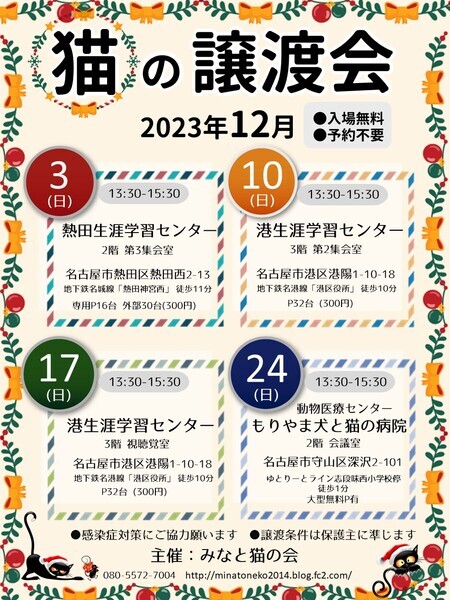 | イベント内容 | ツンデレ猫も、スリゴロ猫も、のんびりさんも、個性豊かな猫たちがたくさん! ◆ペットショップへ行く前にぜひ譲渡会へ◆ ”猫との暮らしをまた考えてみようかな” ”今いるニャンコのお友達を迎えるのは有りなのかな” そんな皆さまもお気軽にご相談ください ●会場は ・駐車場16台+30台有(利用料300円) ・予約不要&入場無料 ●参加猫一覧 http://minatoneko2014.blog.fc2.com/blog-entry-1751.html ●参加猫は ・子猫も成猫も全頭ワクチン接種済 ・ノミダニ駆除済 ・トイレ躾済 ・ケージレストのトレーニング済 ●参加する猫たちについて 基本治療やトイレのしつけは済んでいます 足りないのは共に生きる新しい家族だけです 「譲渡会は行ったことがなくて不安…」 「猫を飼うのははじめて」 「今すぐじゃないけどいずれ猫と暮らしたい」 そんな皆様も大歓迎! ●譲渡に関して ※完全室内飼い・誓約書・治療費負担等の 諸条件があります。 ※譲渡やトライアルに関する契約条件は 猫の保護主によって異なります。 ●譲渡会その他についての問い合わせは みなと猫の会 minatonekonokai@gmail.comもしくは 080-5572-7004 までお願いします。 ♪参加する猫ちょこっと紹介 写真2枚目 チビ君 ♂ 3ヵ月 人が好きすぎる超デレデレねこ 人見知りゼロです! 他の参加猫の紹介など詳しくは下記ブログをご覧ください。 ◎主催者ブログ みなと猫の会 ~こぴっと猫だより~ http://minatoneko2014.blog.fc2.com/ |