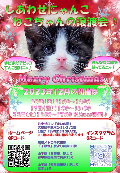 | イベント内容 | 「しあわせにゃんこ」は行き場のない猫ちゃんと里親様との 出逢いの場を提供するグループです♪ 子猫も成猫もハンデのある猫もみんな新しい家族を待っています♪ みなさまのご来場を保護主、スタッフ一同心よりお待ちしております♪ 詳しくはホームページ譲渡会情報をご確認願います。 http://www.shiawasenyanko.net いよいよ2023年もあと1ヶ月! 年末年始を新しいにゃんこと過ごす最後のチャンスです! ぜひご家族皆様でお越し下さい♪ ◆開催日/開催時間◆ 2023年12月10日(日) 11:00~16:00 ご希望の猫ちゃんがいらっしゃる場合は11時30分までに受付をお願い致します。 複数のお申し込みがある場合は11時30分で受付を終了させて頂く場合がございます。 受付をされた全ての里親様とお見合いをさせて頂きます。 ※先着順ではございません。 ※当日、猫ちゃんを連れて帰ることは出来ません。 後日調整のうえ保護主が里親様宅へお届けいたします。 ◆会場◆ 受付はまいの間1階です♪ ※お店の奥に会場への階段がございます♪ 譲渡会場:東京都文京区千駄木2-31-3 1階が北欧雑貨ショップ「SWEDENGRACE」 2階が谷中サロン「まいの間」 ※詳しいアクセスはホームページをご覧下さい http://www.shiawasenyanko.net 谷中サロン「まいの間」の情報はこちら http://neko-to-kyo.com/#maima ◆交通手段◆ 東京メトロ千代田線「千駄木」駅より徒30秒 JR山手線「西日暮里」駅より徒歩11分 JR山手線「日暮里」駅より谷中銀座経由で徒歩13分 ※お車でご来場の際、駐車場のご用意はございません。 近隣のコインパーキング等をご利用ください。※近隣に沢山あります。 いつ里の掲載参加猫一覧はこちらから https://satoya-boshu.net/mypage/foster_list.php?@ps@=none アメーバブログの里親募集にゃんこはこちら https://ameblo.jp/shiawasenyan-ko/theme-10092719565.html ◆猫ちゃんとのお見合い◆ 掲載している猫ちゃんは基本的に譲渡会場でのお見合いのみとなります。 譲渡会への参加が決定している猫ちゃんはその譲渡会で里親様が決定しなかった場合のみ保護主宅でのお見合いが可能となります。 自宅お見合いを希望される里親様はメール(info@shiawasenyanko.net)にてご相談ください。 ◆当譲渡会では猫ちゃんと里親様のスキンシップを大切にしています◆ 新しい家族として20年以上いっしょに暮らしていく猫ちゃんです。 譲渡会場でたくさんの猫ちゃんと触れ合って良きパートナーを見つけてください。 はじめて猫ちゃんを迎える不安や先住猫ちゃんとのトライアルの注意点、猫ちゃんと里親様の暮らし方など気軽にご相談ください。 経験豊富な保護主や猫大好きスタッフがアドバイスさせていただきます。 ◆子猫ご希望の里親様◆ 子猫は急な下痢や発熱等により体調が急変し、数時間対応ができなかっただけでも命を落とす事があります。 その為、当譲渡会では月齢によりお留守番のない又は少ないご家庭への譲渡に限らせて頂いております。 また里親様と子猫ちゃんが安心してトライアル期間を過ごせるよう体重が1㎏程になってからのお届けとさせて頂いております。 ◆里親希望のみなさまへ◆ ご家族の皆様で生涯、家族の一員としてたっぷり愛情を注いでくださるご家庭をお待ちしております。 下記に該当する希望者様へ ・独身、単身者の方 ・友人同士、同棲でのお住まいの方 ・高齢者のみのご家庭の方 は、ご相談の上、譲渡を判断させて頂きます ・適正飼育の不可能な方 ・脱走防止対策を考えて頂けない方 ・定期報告の不可能な方 は、ご遠慮下さいますようお願い致します ◆ご負担頂く費用について◆ 譲渡の際に譲渡負担金(医療費の一部、譲渡金、お届け時の交通費)を里親様にご負担頂く事により 過酷な状況にいる猫ちゃんを保護し新しいご家族の元へ送り出す事ができています。 皆様のご理解とご協力にボランティア一同、心より感謝しております。 ご負担頂く医療費につきましてはホームページに詳しく記載させて頂いております。 http://www.shiawasenyanko.net/onegai.html しあわせにゃんこホームページ http://www.shiawasenyanko.net メールでのお問い合わせ info@shiawasenyanko.net |