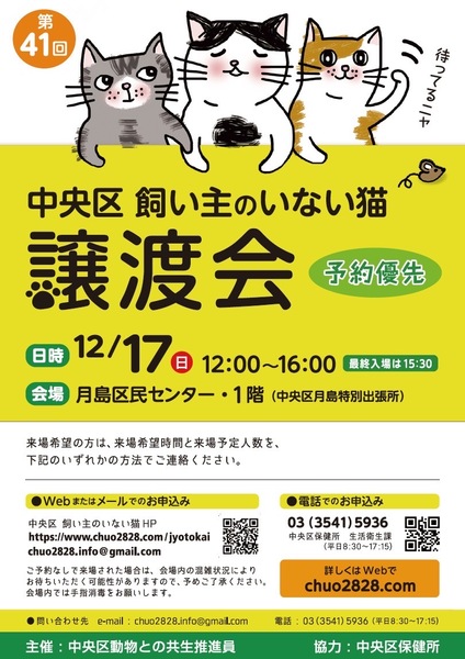 | イベント内容 | 中央区では様々な事情で飼い主のいないネコ達にずっとのおうちを見つけるために中央区動物との共生推進員が中心となって、譲渡会を定期開催しており今回で41回目を数えます。 区内の高齢者からの引き取りネコなど大人猫はもちろん、 子猫たちも参加します。 ※お届けやフォローの関係で中央区在住の方や隣接区在住の方を優先させていただきます。 ※生後2-3ヶ月の子猫は体調の急変もあるため、お留守番の多いご家庭への譲渡はご遠慮いただいておりますので、予めご了承のほどお願いいたします。 ネコとの暮らしをご希望されている方、ネコのお預り希望の方、またネコとの暮らしについて色々ご質問がおありになる方、皆様のご来場をお待ちしております。 ※里親を希望される方は、本人確認できる物をご持参の上、当日会場まで直接お越し下さい。 会場内の混雑を防ぐため、事前に来場希望時間と来場予定人数をご連絡ください。 <譲渡会> 開催日:2023年12月17日(日曜日) 開催時間:12:00〜16:00(最終入場時間15:30) 会場:中央区月島区民センター 1階会議室 譲渡会の事前お申し込みはこちらから → https://www.chuo2828.com/jyotokai 里親さま募集中の猫ちゃんはこちら → https://www.chuo2828.com/catslist 参加猫の情報は、譲渡会の1週間前くらいにWebに掲載する予定です。 今回も1匹でも多くの猫さんたちに、新しい家族とのご縁が繋がりますように。 |