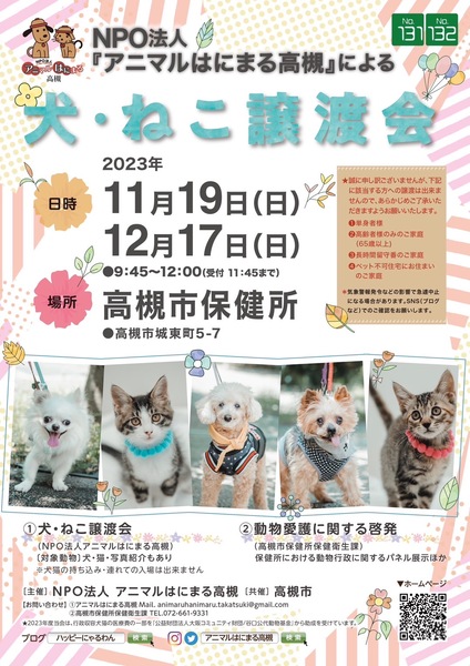| イベント内容 | 参加犬猫たち予定は・・ 保護犬4~5匹 保護猫 未定 です 詳しくは・・ HP「アニマルはにまる高槻」 ブログ「ハッピーにゃるわん」 インスタグラム「アニマルはにまる高槻」 X(Twitter) をご覧ください。 |