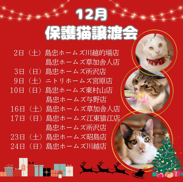 | イベント内容 | 保護猫カフェねこかつさん主催の保護猫譲渡会です? ニトリホームズ宮原店さんでは毎月第2土曜日のみの開催となります。 会場は1階ペット用品売場です。 ご予約、整理券の配布はございませんのでご自由にご参加いただけます☺︎ |