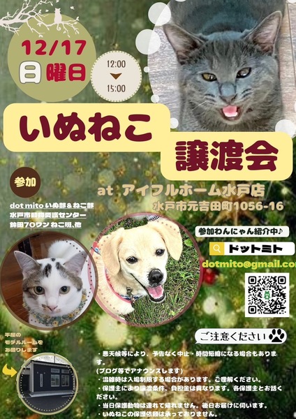 | イベント内容 | ★ 毎月 【 第3 日曜 】 定期開催中★ アイフルホーム水戸店さんのモデルルームにて、いぬねこ譲渡会を開催! ご家族皆さんでお見合いに来てみませんか。 ボランティアや保護犬猫にご興味のある方、 住宅にご興味のある方、 ご来訪大歓迎です。 水戸市愛護センターの収容いぬねこたちも参加しています。 応援よろしくお願いします。 ※使わないフードやおやつ(未開封)、ブランケット、ホッカイロなど、犬猫用品やその他をご寄付頂けるととても助かります。飼い主のいない犬猫や、センター収容動物にて使用させていただきます。 ※保護依頼は承れませんが、アドバイスはやご提案は出来る限りでしています。 ●入場無料 ●予約不要(混雑時は時間制限を設けての入場となります) ●駐車場有(混雑時は近隣パーキングのご利用をお願いすることがあります) ●アイフルホーム水戸店さんの平屋モデルルームにて開催 ★犬猫にも人にも思いやりのある行動をお願いしています。 【参加わんにゃん紹介中】 ★ドットミト ブログ https://ameblo.jp/hibisasumama/ ★ドットミトインスタグラム https://www.instagram.com/shikochan45 |