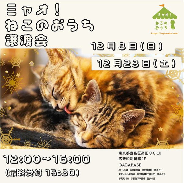 | イベント内容 | 参加する保護猫ちゃんはホームページが最速で更新されます。 およそ譲渡会一週間程前よりホームページにてご確認いただけます。 https://myaoneko.com/cats/ 事前予約はできません。 猫ちゃんをお世話することになるご家族皆様でお越しくださると嬉しいです。 譲渡会場でお会いしましょう♪ 会場にて、以下の点をお願いをしております。 ✿手指消毒 ✿連絡先のご記入 新型コロナウイルスおよび猫さん感染症対策のため、猫さんと触れ合う際には手指消毒をお願いしております。 御来場者多数の場合には入場制限を設けさせていただきます。 ※当日沢山のご来場者様がいらっしゃった場合、整理券をお渡しする事がございます。 会場内外で長時間お待たせする場合もございますが、ご理解くださいますようお願い致します。 結果のご連絡は、当日夜〜翌日夜までの間に、お電話もしくはメールにて保護主より直接ご連絡いたします。 ◇譲渡に関してのお願い 【ミャオ!ねこのおうち】では譲渡に際して、以下の要件をお願いしております。 ・完全室内飼いで終生愛育 ・脱走させないための対策 ・不妊去勢手術 ・譲渡誓約書の取り交わし ・医療費の一部ご負担 ※60才以上の方のみのご家庭、独身や、経済的に困難な世帯、 必要な脱走対策を施していただけない方には原則的に譲渡はご遠慮頂いております。 また、保護主により譲渡条件が異なる場合もございますので会場でご相談ください。 参加予定ねこちゃんは、急な体調不良などで不参加になる場合もございます。 【譲渡に関してのお願い】・【医療費の一部のご負担】・【譲渡までの流れ】など 詳しくは下記ホームページをご覧くださいますよう宜しくお願い致します。 ミャオ!ねこのおうち ホームページ https://myaoneko.com |