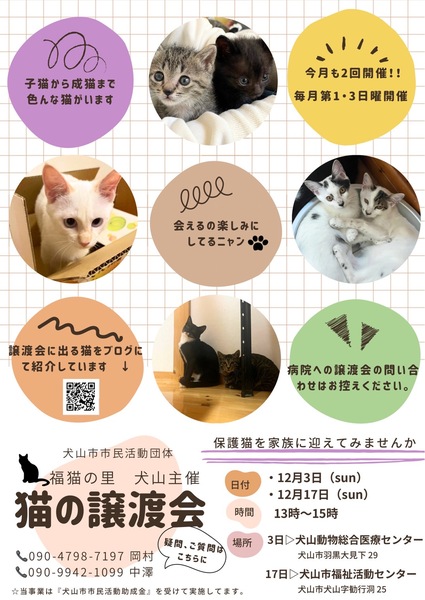 | イベント内容 | 【ココがポイント!】 ★ウイルスチェックなど健康診断済み! 【日時】 12月17日(日)13~15時 【場所】 犬山市福祉活動センターセンター (犬山市犬山字勧行洞25) 予約不要 広々駐車場あり 福猫の里 犬山「福猫の里便り」 https://hukunekonosato.hatenablog.com/ 問い合わせ先(福猫の里 犬山) a-saoka.922@outlook.com ーーーーーーーーー 【お約束】 当日、会場での猫の引き渡しはしておりません。 後日ご自宅までお届けします。 お試し飼育(トライアル)を1週間して頂き、双方が納得の上で正式譲渡となります。 譲渡の際は、医療費の一部の負担をお願いしております。(ワクチン代 等) ・ペット可のお住まい ・完全室内飼育、終生飼育 ・適切な医療措置 ・不妊手術の実施と報告等、お約束があります。 |