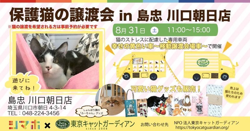 | イベント内容 | 幸せの黄色い車~移動譲渡会場車~が、島忠川口朝日店さんにやってきます! 猫のメンタルに配慮した、特別仕様の車です。 猫たちに会いに来ていただけること 猫グッズ購入で支援してくださること 幸せ黄色い車を見に来ていただけること 全てがご支援になります。 お友達とお誘い合わせの上ぜひよろしくお願いいたします! 会場では、可愛い猫グッズも販売します! しょんぼり顔のふわふわ猫、ふーちゃんのオリジナルグッズも限定発売★ 「子猫の家族になりたい」「可愛い猫グッズが欲しい」「遊びに行くことで支援したい」 という方は是非いらしてください! ★猫の里親になるには事前申し込みが必要です★ 申し込みはコチラ https://tokyocatguardian.org/cats_event/ 「幸せの黄色い車」の詳細についてはコチラ https://tokyocatguardian.org/yellow_car/ 【会場案内】 島忠 川口朝日 様 〒332-0001 埼玉県川口市朝日4-3-14 google map:https://goo.gl/maps/R848UPthnJL2 (アクセス) 【最寄り駅からの交通アクセス】 JR西川口駅 市立高校弥平行きバスにて 南4丁目下車 徒歩5分。 有明通り 前田東公園そば。南鳩ヶ谷駅下車徒歩5分。 【駐車場のご案内】 大型駐車場完備 料金:無料 |