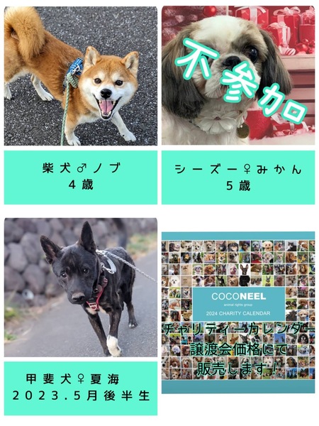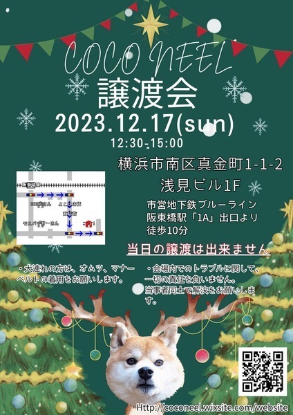 | イベント内容 | COCO NEEL譲渡会IN横浜 2023.12.17 (日) ・会場・ 横浜市南区真金町1-1-2 浅見ビル1F 駐車場の用意はありません。 近隣のコインパーキングのご利用をお願いいたします。 ・時間・ 12:30~15:00 ※参加犬詳細はブログでご確認お願いします。 https://ameblo.jp/coconeel-animalrights |