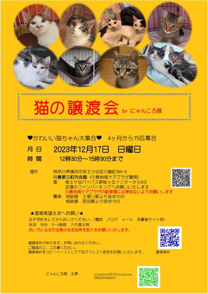 | イベント内容 | 猫ちゃんの譲渡会を開催いたします。 4ヶ月位からの猫さん15匹位 大人猫さんも参加です。 月 日 2023年 12月17日 日曜日 時 間 12時30分~15時30分まで 場所 神奈川県横浜市保土ケ谷区川島町360-6 川島第三町内会館(川島地域ケアプラザ裏側) 車 保土ケ谷バイパス新桜ヶ丘インターから8分 近隣のコインパーキングにお願いいたします。 (手前にある川島地域ケアプラザの駐車場には停めないでください) 電車 相鉄線 上星川駅より徒歩10分 相鉄線 西谷駅より徒歩15分 ★里親希望さまへお願い★ 必ず予約をしてからおいでください。 各回 30分 3~4組様 おいでになる方全員の氏名住所を記入をお願いいたします。 譲渡条件があります。お問い合わせください。 ご確認の上、ご応募ください。 猫の譲渡について http://nyankorotai.blog.fc2.com/blog-category-5.html 上記の譲渡条件をコピーペーストして下記アドレスへ送ってください。 追ってご連絡いたします。 お電話にても受付いたします。 下記の譲渡条件を送ってくださっても大丈夫です。 ◆ご応募時に下記事項をお知らせください◆ 1.お名前、簡単な住所 2.先住動物の有無(ワクチン 不妊手術の有無等)と選んだ理由 3.家族構成(家族全員の年齢 関係 お仕事等) 4.住宅環境(一戸建て 分譲マンション 一戸建て賃貸 賃貸マンションペット可) 5.留守番の時間 6.下記の①~⑧までの同意 ◆応募者様へのお願い◆ ①一生涯、家族の一員としてくださる事(猫は20年生きます) ②完全室内飼いでお願いします。 (脱走防止対策をお願いします。ケージ 脱走防止扉 玄関窓等) ③不妊手術及び毎年のワクチン接種など健康管理 (不妊手術済のご連絡は必須) ④家族全員の同意があること ⑤ペット可住宅にお住まいであること。 (ペット不可にお住まいの方には譲渡できません) ⑥身分証明の提示及び誓約書を記入していただきます。 ⑦譲渡後の近況報告をしていただける方 ⑧譲渡費用等をご負担できる方 (初期医療行為は済ませてお届けします) 猫が小さい場合はお留守番の短い家を希望します。 ケージのご用意をお願いいたします。 申し訳ありませんが先住動物さんが4匹以上のご家庭はお断りさせていただいております。 無職 学生 未成年の方からの申込は受け付けておりません。 ご家族に未就学児のいるお家及び高齢者の方は要相談 2匹一緒を優先させていただきます。 双方の条件が合った場合は譲渡会又は保護先にお見合にきていだだき成立後に自宅室内へお届けいたします。 この時期なので近くに方を優先させていただく事もあります。 ご連絡お待ちしております。 にゃんころ隊 http://nyankorotai.blog.fc2.com 担当 北澤(にゃんころ隊) chieminn4057@icloud.com |
