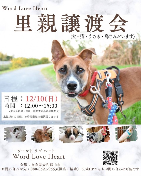 | イベント内容 | ワールドラブハートで里親募集中の動物たちの譲渡会を開催します! 犬猫だけではなく、インコやラット、ウサギにモルモットなどたくさんの保護動物がいます! みんな新しい家族を探しています。写真だけでは伝えきれない魅力が盛りだくさん! 実際に会ってそのかわいさを実感してください♪ ★里親募集中の動物たち★ https://satoya-boshu.net/foster/?@button_name@=search&FosterParent_MemberID=1161 ・犬、猫 ・ウサギ ・インコ ・キンカチョウ ・ウコッケイ ・ヘビ ・カメ ……など 子犬や子猫もたくさんいますよ♡ ぜひお気軽にお越しください! ●混雑をさけるために、事前予約をお願いします。 予約番号080-8521-9553 ショートメールでも可♪ ●当日までに譲渡が決定した・体調がすぐれないなど、やむを得ない理由で不参加の場合があります。ご希望の子がいましたら、当日お問い合わせください。 ●当日、その場での引き渡しはしておりません。譲渡決定後、自宅訪問を兼ねてこちらからお届け致します。 ご来場お待ちしております♪ ★world love heart(ワールドラブハート)は、奈良県大和郡山市で活動している動物保護団体です。 『引き取り依頼は断らない』をモットーに、犬、猫、鶏、小動物、家畜、爬虫類など捨てられた動物を保護しています。 https://worldloveheart-nara.jimdofree.com |
