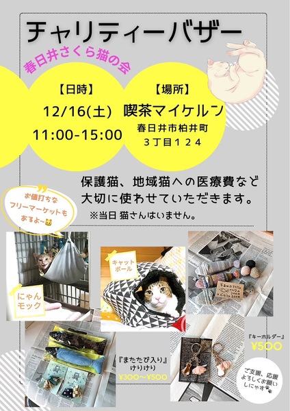 春日井さくら猫の会チャリティーバザーを開催します。魅力的な猫グッズてんこ盛りです!