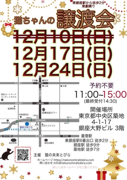 | イベント内容 | 東銀座で保護猫の譲渡会を開催しています「猫の未来とびら」です♪ 恵まれない環境にいる猫たちが未来へのとびらを開いて幸せなご縁に繋がる橋渡しをしていきます。 たくさんの猫ちゃんと保護主・スタッフ一同みなさまのご来場を心よりお待ちしています! 子猫ちゃん〜成猫ちゃんまで参加します♪ ※コロナ対策のマスク着用が緩和され, マスクを着用するかどうかは個人の判断となりましたが、 感染防止対策の上では、マスクは有効な手段です。 当会としましては、従来通りマスク着用をお願いしたいと思います※ 【ご来場いただく皆様には下記についてお願い致します】 ★不織布マスクの着用をお願い致します。 ★譲渡会場にお入り頂く前に手洗いと手の消毒をお願い致します。 ★熱のある方や体調の優れない方は譲渡会への来場を見合わせて頂けますよう、お願い致します。 ★来場者数によりましては人数制限もありますので長時間お待たせてする場合もございます。 予めご了承下さい。 コロナウイルス感染防止の為、大変恐縮ですが何卒ご理解とご協力、ご了承をいただけますようお願い致します。 ★☆★★☆★★☆★★☆★★☆★★☆★★☆★★☆★★☆★ ★開催日時 2023年12月17日(日) 11:00~15:00(最終受付 14:30) ★会場 東京都中央区築地4-1-17 銀座大野ビル 3階 (東劇となり) ★最寄駅 東銀座駅 6番出口 徒歩2分 銀座駅 徒歩9分 ・築地駅 徒歩7分 駐車場は当ビル又は近隣のコインパーキング等をご利用ください。 会場への直接のお問い合わせはご遠慮くださいませ。 ★☆★★☆★★☆★★☆★★☆★★☆★★☆★★☆★★☆★ 会場で猫ちゃんと触れ合ってご縁を繋いでください。 里親様・猫ちゃんが双方、幸せな家族になれるよう保護主・スタッフがサポート致します。 ご不安な事はお気軽にご相談ください。 入場無料です。事前のご予約は不要です。 当日猫ちゃんの引き渡しはございません。 後日、保護主が里親様宅へお届けいたします。 ※参加予定猫ちゃんは、急な体調不良等で不参加になる場合もございます。 開催当日の朝、当会ブログにて不参加の最新情報を掲載致しますのでご確認をお願い申し上げます。 ◇譲渡に関してのお願い・基本条件 1.家族の一員として終生最期まで愛育下さい。 2.完全室内飼い・ペット可のお住まい(契約書を拝見致します) 3.脱走防止対策 4.避妊・去勢手術 5.里親様のご自宅へのお届け 6.譲渡誓約書への署名捺印・身分証明書の提示 7.医療費譲渡金のご負担 8.定期報告 9.トライアル期間有り ※保護主により譲渡条件は異なりますので会場で直接ご相談ください。 60才以上の方のみのご家庭、未成年の方、単身の方、同棲中の方、 小学生低学年以下のお子様のいる方、必要な脱走対策を施していただけない方は譲渡をご遠慮頂く場合もございますのでご了承ください。 仔猫の場合は主にお世話される方のご年齢は55歳までとさせて頂きます。 オーバーする方はご相談くださいませ。 小さな子猫の譲渡は体重が1kgになってからのお届けやお留守番の無い(少ない)ご家庭を希望いたします。 医療費譲渡金に関しましては詳しくはホームページの 【譲渡に関してのお願い】【譲渡の流れ】をご覧くださいませ。 ~主催 猫の未来とびら~ |