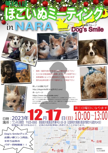 | イベント内容 | 12月17日(日曜日)10時~13時、奈良県大和高田市のワンネス財団エモーショナルリテラシーセンターにて「第98回ほごいぬミーティングat奈良大和高田」を開催します。 保護犬を家族に迎えようと考えている方、保護犬に会ってみたい方、保護犬について知りたい方、ぜひご来場ください。 相性を見るためなど先住わんこさん、卒業わんこさんのご参加ももちろんOKです。 当日は、Dog's smileグッズやワンコ用品の販売、Dog's smileを応援してくださる方々が手作りされた手作り雑貨などの販売も行います。どれもお買い得です。 また、売り上げは、私たちの活動資金になります。ぜひご協力をお願いします。 来場者のみなさまには、コロナウイルス感染拡大防止に御協力をお願いします。 ・発熱・風邪の症状のある方の入場は御遠慮願います。 ・入場時は、手指消毒への御協力をお願いします。 ・来場者の状況により、入場制限を行う場合があります。 なお、来場予定のワンコについては、活動ブログでご確認ください。 日時 令和5年12月17日(日)午前10時~午後1時 場所 ワンネス財団エモーショナルリテラシーセンター 奈良県大和高田市東中2-10-18 (近鉄南大阪駅高田市駅から南に徒歩14分) 協力 ワンネス財団、株式会社松田電気工業 |