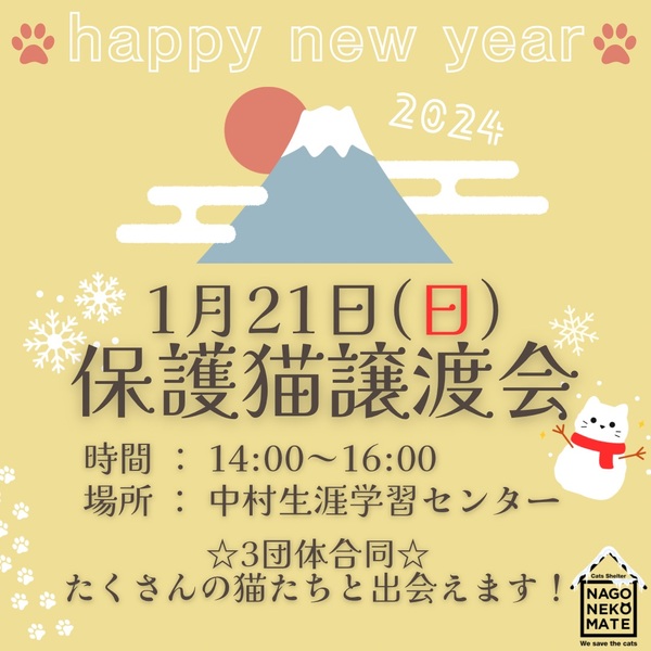 | イベント内容 | ねこの里親になりませんか? 可愛い猫たちが新しい家族を待っています♡ ご覧いただきありがとうございます 保護猫団体「なごねこめいと」です 譲渡会のお知らせです↓↓ 日時 1月21日(日)14時~16時 場所 中村生涯学習センター 主催 ラブキャッツ 愛知フォレストキャッツ なごねこめいと 3団体合同の譲渡会です! たくさんの猫と出会えます☆ 地域猫活動やTNR活動の過程などで 保護した猫たち 子猫もいれば、大人猫もいます 見学、相談だけでも大丈夫! 予約不要、参加費無料なのでお気軽に 猫に関する活動を何かしたい、という方も歓迎です 遊びに来る感覚で、お越しくださいませ♬ 毎月保護猫譲渡会を開催しております。 ほかのイベント情報もご覧下さい♡ ☆猫に関して☆ 各団体の保護主さんごとに決めているお約束事があります ・当日は猫を連れ帰ることはできません ・猫を迎えるにあたり、飼育環境などについて お話しをさせていただきトライアル(お試し飼育) から始めさせていただきます ・2週間前後のトライアル期間を経て、問題ない ようであれば、譲渡契約書を結び正式譲渡と なります ・所定の譲渡費用をいただきます |