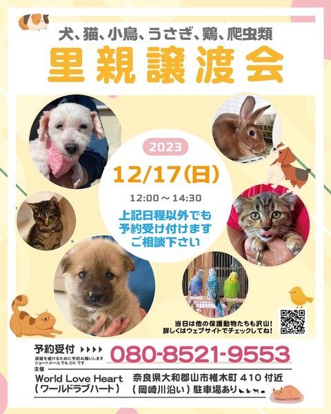 | イベント内容 | ワールドラブハートで里親募集中の動物たちの譲渡会を開催します! 犬猫だけではなく、インコやラット、ウサギにモルモットなどたくさんの保護動物がいます! みんな新しい家族を探しています。写真だけでは伝えきれない魅力が盛りだくさん! 実際に会ってそのかわいさを実感してください♪ ★里親募集中の動物たち★ https://satoya-boshu.net/foster/?@button_name@=search&FosterParent_MemberID=1161 ・犬、猫 ・ウサギ ・インコ ・キンカチョウ ・ウコッケイ ・ヘビ ・カメ ……など 子犬や子猫もたくさんいますよ♡ ぜひお気軽にお越しください! ●混雑をさけるために、事前予約をお願いします。 予約番号080-8521-9553 ショートメールでも可♪ ●当日までに譲渡が決定した・体調がすぐれないなど、やむを得ない理由で不参加の場合があります。ご希望の子がいましたら、当日お問い合わせください。 ●当日、その場での引き渡しはしておりません。譲渡決定後、自宅訪問を兼ねてこちらからお届け致します。 ご来場お待ちしております♪ ★world love heart(ワールドラブハート)は、奈良県大和郡山市で活動している動物保護団体です。 『引き取り依頼は断らない』をモットーに、犬、猫、鶏、小動物、家畜、爬虫類など捨てられた動物を保護しています。 https://worldloveheart-nara.jimdofree.com |