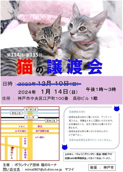 | イベント内容 | 子猫だらけの譲渡会です。 可愛い姿を見に来てください 猫たちが幸せになるために、新しいお家を求めて参加します(=^・^=) 猫は後日こちらからお届けをさせて頂き、お家の環境を見せて頂ければと思います。 仔猫は20年くらい生きる子もいますので、ご自身の年齢に合った猫さんとの出会いを探しに来てください。 ペット不可にお住まいの方はご遠慮ください!(ご確認してください。) 譲渡には条件が多数ありますので、ご理解くださいませ<m(__)m>。 まずはお試しで猫との相性を見てから、正式譲渡となります。 また、猫を保護して里親を探そうと思われている方も、〖参加猫の募集〗をしていますので、お申し込みくださいね! アドレス miina0807@y5.dion.ne.jp にご連絡をください。 お越しの際は各路線の三宮駅からは徒歩10分くらい、車でお越しの場合は近隣のコインパーキングなどにお停めください。 当日、体調の悪い方、発熱がある方、このような方はご遠慮ください。 定例の毎月は第2日曜日に譲渡会を開催しておりますので、次回の出会いに期待をしてくださいね。 ブログ: 猫のミーナといっしょ http://miina300.blog.fc2.com/ ねこのオカン https://ameblo.jp/miina300/ |