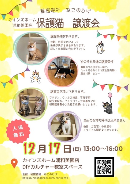 | イベント内容 | 【秘密結社ねこのひげ♡保護猫譲渡会】 12/17(日) 13:00~16:00 さいたま市緑区美園1-11-1 カインズホーム浦和美園店2F DIYカルチャー教室スペース内 にて保護猫譲渡会を開催します☆ 夏・秋生まれの仔猫~ まだまだ子猫だにゃー!なヤング猫や 小童には負けへんでー!なオトナ猫も♪ 合計15頭ほどが参加予定です♪ 未来のご家族さまと 愛し愛されな 両想いになれますように♡ 家族にするなら保護猫だべ♪♪ こんなご時世だけど 新しい家族と笑顔で暮らしたい♪ という方は是非会いにいらしてください♡ ご不明な点がございましたら インスタグラム @秘密結社ねこのひげ の DMまでお問い合わせ下さい☆ |