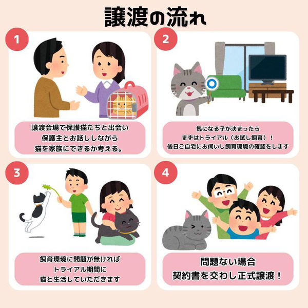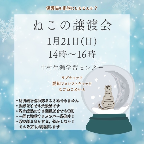 | イベント内容 | 保護猫の里親になりませんか? 日時 1月21日(日) 14時〜16時 場所 中村生涯学習センター 名古屋市中村区鳥居通3-1-3 主催 ラブキャッツ 愛知フォレストキャッツ なごねこめいと 地域猫活動やTNR活動の過程などで 保護した猫たち 子猫もいれば、大人猫もいます この時期は5〜9ヶ月程度の 子猫が多く参加します 見学、相談だけでも大丈夫! 予約不要、参加費無料なのでお気軽に 猫に関する活動を何かしたい、という方も歓迎です 遊びに来る感覚で、お越しくださいませ ☆猫に関して☆ 各団体の保護主さんごとに決めているお約束事があります ・当日は猫を連れ帰ることはできません ・猫を迎えるにあたり、飼育環境などについて お話しをさせていただきトライアル(お試し飼育) から始めさせていただきます ・2週間前後のトライアル期間を経て、問題ない ようであれば、譲渡契約書を結び正式譲渡と なります ・所定の譲渡費用をいただきます |