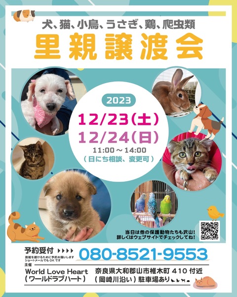 | イベント内容 | ワールドラブハートで里親募集中の動物たちの譲渡会を開催します! 犬猫だけではなく、インコやラット、ウサギにモルモットなどたくさんの保護動物がいます! みんな新しい家族を探しています。写真だけでは伝えきれない魅力が盛りだくさん! 実際に会ってそのかわいさを実感してください♪ ★里親募集中の動物たち★ https://satoya-boshu.net/foster/?@button_name@=search&FosterParent_MemberID=1161 ・犬、猫 ・ウサギ ・インコ ・キンカチョウ ・ウコッケイ ・ヘビ ・カメ ……など 子犬や子猫もたくさんいますよ♡ ぜひお気軽にお越しください! ●混雑をさけるために、事前予約をお願いします。 予約番号080-8521-9553 ショートメールでも可♪ ●当日までに譲渡が決定した・体調がすぐれないなど、やむを得ない理由で不参加の場合があります。ご希望の子がいましたら、当日お問い合わせください。 ●当日、その場での引き渡しはしておりません。譲渡決定後、自宅訪問を兼ねてこちらからお届け致します。 ご来場お待ちしております♪ ★world love heart(ワールドラブハート)は、奈良県大和郡山市で活動している動物保護団体です。 『引き取り依頼は断らない』をモットーに、犬、猫、鶏、小動物、家畜、爬虫類など捨てられた動物を保護しています。 https://worldloveheart-nara.jimdofree.com |