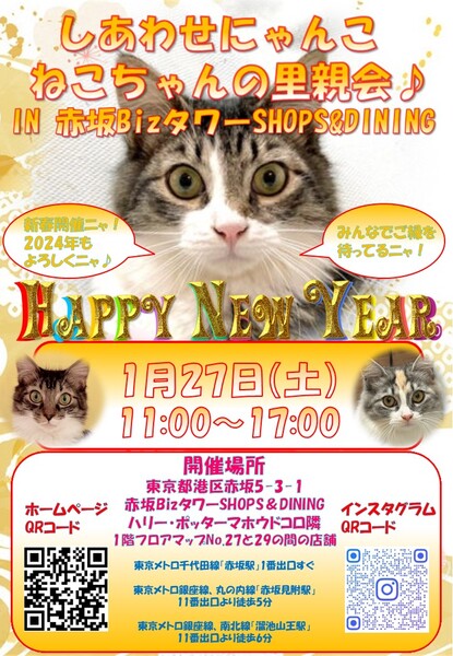 | イベント内容 | 「しあわせにゃんこ」は行き場のない猫ちゃんと里親様との 出逢いの場を提供するグループです♪ 子猫も成猫もハンデのある猫もみんな新しい家族を待っています♪ みなさまのご来場を保護主、スタッフ一同心よりお待ちしております♪ 詳しくはホームページ譲渡会情報をご確認願います。 http://www.shiawasenyanko.net またまたしあわせにゃんこが赤坂に上陸します! ぜひご家族皆様でお越し下さい♪ ◆開催日/開催時間◆ 2024年1月27日(土) 11:00~17:00 ご希望の猫ちゃんがいらっしゃる場合は11時30分までに受付をお願い致します。 複数のお申し込みがある場合は11時30分で受付を終了させて頂く場合がございます。 受付をされた全ての里親様とお見合いをさせて頂きます。 ※先着順ではございません。 ※当日、猫ちゃんを連れて帰ることは出来ません。 後日調整のうえ保護主が里親様宅へお届けいたします。 ◆会場◆ 東京都港区赤坂5-3-1 赤坂BizタワーSHOPS&DINING 仲通り ハリー・ポッターマホウドコロの隣 1階フロアガイドNo.27と29の間の店舗 ※詳しいアクセスはホームページをご覧下さい http://www.shiawasenyanko.net ◆交通手段◆ 東京メトロ千代田線「赤坂」駅1番出口直結 東京メトロ銀座線、丸の内線「赤坂見附」駅11番出口より徒歩5分 東京メトロ銀座線、南北線「溜池山王」駅11番出口より徒歩6分 ※お車でご来場の際、駐車場のご用意はございません。 近隣のコインパーキング等をご利用ください。※近隣に沢山あります。 いつ里の掲載参加猫一覧はこちらから https://satoya-boshu.net/mypage/foster_list.php?@ps@=none アメーバブログの里親募集にゃんこはこちら https://ameblo.jp/shiawasenyan-ko/theme-10092719565.html ◆猫ちゃんとのお見合い◆ 掲載している猫ちゃんは基本的に会場でのお見合いのみとなります。 譲渡会への参加が決定している猫ちゃんはその譲渡会で里親様が決定しなかった場合のみ保護主宅でのお見合いが可能となります。 自宅お見合いを希望される里親様はメール(info@shiawasenyanko.net)にてご相談ください。 ◆当譲渡会では猫ちゃんと里親様のスキンシップを大切にしています◆ 新しい家族として20年以上いっしょに暮らしていく猫ちゃんです。 譲渡会場でたくさんの猫ちゃんと触れ合って良きパートナーを見つけてください。 はじめて猫ちゃんを迎える不安や先住猫ちゃんとのトライアルの注意点、猫ちゃんと里親様の暮らし方など気軽にご相談ください。 経験豊富な保護主や猫大好きスタッフがアドバイスさせていただきます。 ◆子猫ご希望の里親様◆ 子猫は急な下痢や発熱等により体調が急変し、数時間対応ができなかっただけでも命を落とす事があります。 その為、当譲渡会では月齢によりお留守番のない又は少ないご家庭への譲渡に限らせて頂いております。 また里親様と子猫ちゃんが安心してトライアル期間を過ごせるよう体重が1㎏程になってからのお届けとさせて頂いております。 ◆里親希望のみなさまへ◆ ご家族の皆様で生涯、家族の一員としてたっぷり愛情を注いでくださるご家庭をお待ちしております。 下記に該当する希望者様へ ・独身、単身者の方 ・友人同士、同棲でのお住まいの方 ・高齢者のみのご家庭の方 は、ご相談の上、譲渡を判断させて頂きます ・適正飼育の不可能な方 ・脱走防止対策を考えて頂けない方 ・定期報告の不可能な方 は、ご遠慮下さいますようお願い致します ◆ご負担頂く費用について◆ 譲渡の際に譲渡負担金(医療費の一部、譲渡金、お届け時の交通費)を里親様にご負担頂く事により 過酷な状況にいる猫ちゃんを保護し新しいご家族の元へ送り出す事ができています。 皆様のご理解とご協力にボランティア一同、心より感謝しております。 ご負担頂く医療費につきましてはホームページに詳しく記載させて頂いております。 http://www.shiawasenyanko.net/onegai.html しあわせにゃんこホームページ http://www.shiawasenyanko.net メールでのお問い合わせ info@shiawasenyanko.net |