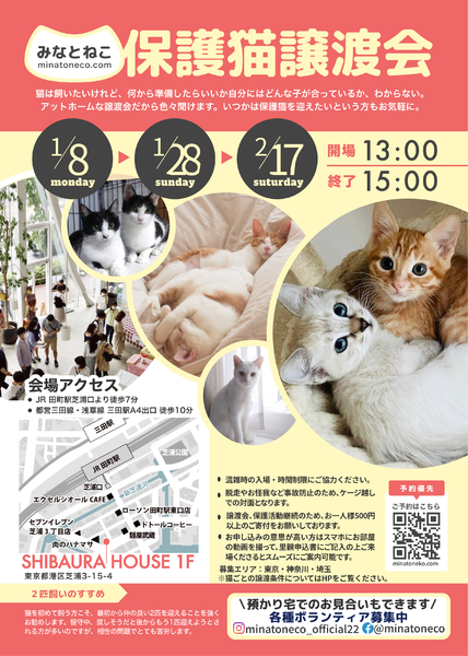 | イベント内容 | みなとねこが毎月定期開催している譲渡会です 2023年も譲渡会を通じて270匹もの猫と里親さんのご縁を繋ぐことができました 譲渡会にはご来場予約が必要です ご予約はみなとねこのHPよりお願いします https://www.minatoneco.com/event 参加猫の詳細はこちら https://www.minatoneco.com/gallery 参加猫たちの様子はYoutubeのみなとねこチャンネルもご覧ください https://youtube.com/playlist?list=PLRxhCqU-Dt77IaUtZCDeratPPI7Jek6ZL ーーー 会場は明るく開放的な雰囲気です Youtube「みなとねこ譲渡会に行ってみよう」 https://youtu.be/8Q4Gti1swQk 30ケージ 60匹ほどの参加となりますが、それ以外の預かり宅の猫もご紹介可能です 子猫は2匹ペアでの譲渡が原則です 初めての方こそ最初から2匹をお勧めしています また私たちボランティアは、ご縁のあった猫たちに終生里親様に愛されて幸せに安全に暮らして欲しいと願っています このため里親になっていただくにはいくつかの条件やお約束事があります。 ◆基本条件(猫それぞれ、保護主により異なります) ・ご家族全員が飼育に賛成であること ・ペット可物件での完全室内飼い、エアコンなどによる室温管理、医師の指示に従い定期的な受診やワクチン接種、 適切な時期(生後4ヶ月中)での避妊去勢、病気予防に配慮したフードの選択、終生飼養をお願いしております。 ・ケージのみの飼育、リビング以外の一室のみでの飼育は不可です。十分な運動のスペースと窓から景色が眺められのんびり日向ぼっこが可能な環境が望ましいと考えています。 ・誤食などの事故防止のため、お部屋の整理整頓や脱走防止にも万全の対策をお願いします。 ・換気が十分でない室内での喫煙をされる方はお断りしております。 ・日々のお世話だけでなく、スキンシップが可能な精神的・時間的・経済的な余裕がある方に限らせていただきます。猫が20年以上生きる中でなるべく変わらぬ環境で愛情を注いで頂けるよう、家族構成やお仕事、お住まいに変化のない方を優先させていただきます。 またお届けやフォローの都合上、募集エリアも東京、神奈川、埼玉に限らせていただいております。 ■里親申込書類一式はみなとねこHPよりダウンロードをお願いします https://www.minatoneco.com/foster-entry 会場では里親申込書を拝見して簡単な面談を行います 会場にてご記入いただくことも可能ですが、面談希望の方が多いとお待ちいただくことになりますので、お手元で印刷していただきご記入の上ご来場いただくことをおすすめしております ※ご家族にアレルギーがある方、喫煙者がいる場合には是非事前にご相談ください ※猫と暮らしたことのない未就学児がいらっしゃる場合には事前にアレルギー検査などお勧めします 実際の参加予定猫 1/7(日)21:00までにみなとねこのHPやFacebookページでご紹介します https://m.facebook.com/minatoneco/ 直接ご応募の方は詳細をLINEなどでやりとりの上で預かり宅でのお見合いも行っております そうした中で譲渡会前に里親様が決定することもございますことご了承ください ※予約優先、30分入替制、混雑時は入場をお待ちいただくなどのご協力をお願いしております ※換気のためにドアをオープンしての開催のためにケージ越しでのご対面となりますことご理解ください ※譲渡会の開催や保護活動の継続のため、お一人様500円以上のご寄付をお願いしております |