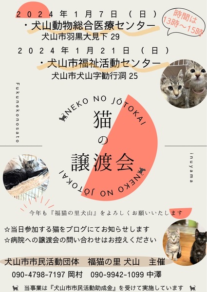 | イベント内容 | 【ココがポイント!】 ★ウイルスチェックなど健康診断済み! 【日時】 1月21日(日)13~15時 【場所】 犬山市福祉活動センターセンター (犬山市犬山字勧行洞25) 予約不要 広々駐車場あり 福猫の里 犬山「福猫の里便り」 https://hukunekonosato.hatenablog.com/ 問い合わせ先(福猫の里 犬山) a-saoka.922@outlook.com ーーーーーーーーー 【お約束】 当日、会場での猫の引き渡しはしておりません。 後日ご自宅までお届けします。 お試し飼育(トライアル)を1週間して頂き、双方が納得の上で正式譲渡となります。 譲渡の際は、医療費の一部の負担をお願いしております。(ワクチン代 等) ・ペット可のお住まい ・完全室内飼育、終生飼育 ・適切な医療措置 ・不妊手術の実施と報告等、お約束があります。 |