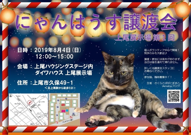 | イベント内容 | 日時 8月4日(日) 12時~15時 場所 埼玉県上尾市久保49-1 上尾ハウジングステージ内 ダイワハウス上尾展示場室内1階 JR北上尾駅より 徒歩5分 場内に無料駐車場があります。 綺麗な住宅展示場室内でのステキな譲渡会です˖✧✧˖° たくさんの猫たちが家族を探しています。 是非お越しくださいませ。 ※猫は当日は連れて帰れません。 アンケートに記入していただき、飼育環境などのお話をさせて頂いたのち、 ご自宅まで伺いトライアルを経てからの正式譲渡となります。 参加猫の情報が見れます。 主催者ブログ https://ameblo.jp/ayacha-ya/ |