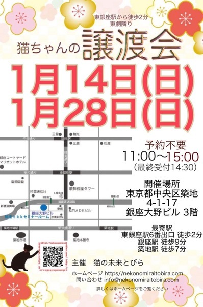 | イベント内容 | 東銀座で保護猫の譲渡会を開催しています「猫の未来とびら」です♪ 恵まれない環境にいる猫たちが未来へのとびらを開いて幸せなご縁に繋がる橋渡しをしていきます。 たくさんの猫ちゃんと保護主・スタッフ一同みなさまのご来場を心よりお待ちしています! 子猫ちゃん〜成猫ちゃんまで参加します♪ ※コロナ対策のマスク着用が緩和され, マスクを着用するかどうかは個人の判断となりましたが、 感染防止対策の上では、マスクは有効な手段です。 当会としましては、従来通りマスク着用をお願いしたいと思います※ 【ご来場いただく皆様には下記についてお願い致します】 ★不織布マスクの着用をお願い致します。 ★譲渡会場にお入り頂く前に手洗いと手の消毒をお願い致します。 ★熱のある方や体調の優れない方は譲渡会への来場を見合わせて頂けますよう、お願い致します。 ★来場者数によりましては人数制限もありますので長時間お待たせてする場合もございます。 予めご了承下さい。 コロナウイルス感染防止の為、大変恐縮ですが何卒ご理解とご協力、ご了承をいただけますようお願い致します。 ★☆★★☆★★☆★★☆★★☆★★☆★★☆★★☆★★☆★ ★開催日時 2024年1月14日(日) 11:00~15:00(最終受付 14:30) ★会場 東京都中央区築地4-1-17 銀座大野ビル 3階 (東劇となり) ★最寄駅 東銀座駅 6番出口 徒歩2分 銀座駅 徒歩9分 ・築地駅 徒歩7分 駐車場は当ビル又は近隣のコインパーキング等をご利用ください。 会場への直接のお問い合わせはご遠慮くださいませ。 ★☆★★☆★★☆★★☆★★☆★★☆★★☆★★☆★★☆★ 会場で猫ちゃんと触れ合ってご縁を繋いでください。 里親様・猫ちゃんが双方、幸せな家族になれるよう保護主・スタッフがサポート致します。 ご不安な事はお気軽にご相談ください。 入場無料です。事前のご予約は不要です。 当日猫ちゃんの引き渡しはございません。 後日、保護主が里親様宅へお届けいたします。 ※参加予定猫ちゃんは、急な体調不良等で不参加になる場合もございます。 開催当日の朝、当会ブログにて不参加の最新情報を掲載致しますのでご確認をお願い申し上げます。 ◇譲渡に関してのお願い・基本条件 1.家族の一員として終生最期まで愛育下さい。 2.完全室内飼い・ペット可のお住まい(契約書を拝見致します) 3.脱走防止対策 4.避妊・去勢手術 5.里親様のご自宅へのお届け 6.譲渡誓約書への署名捺印・身分証明書の提示 7.医療費譲渡金のご負担 8.定期報告 9.トライアル期間有り ※保護主により譲渡条件は異なりますので会場で直接ご相談ください。 60才以上の方のみのご家庭、未成年の方、単身の方、同棲中の方、 小学生低学年以下のお子様のいる方、必要な脱走対策を施していただけない方は譲渡をご遠慮頂く場合もございますのでご了承ください。 仔猫の場合は主にお世話される方のご年齢は55歳までとさせて頂きます。 オーバーする方はご相談くださいませ。 小さな子猫の譲渡は体重が1kgになってからのお届けやお留守番の無い(少ない)ご家庭を希望いたします。 医療費譲渡金に関しましては詳しくはホームページの 【譲渡に関してのお願い】【譲渡の流れ】をご覧くださいませ。 ~主催 猫の未来とびら~ |