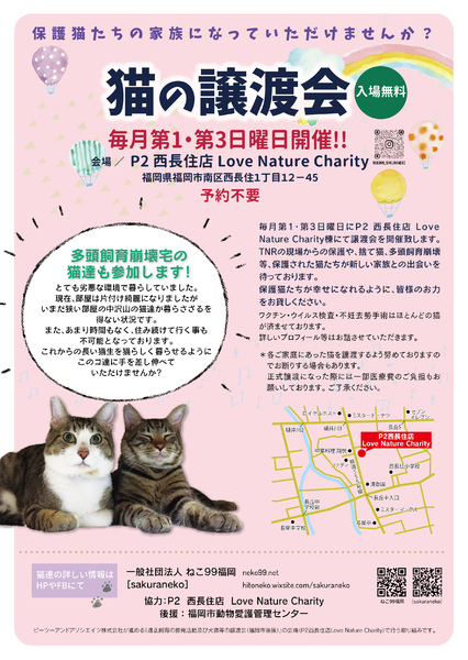 | イベント内容 | 【P2譲渡会は予約不要の譲渡会です】 参加団体/ねこ99福岡・紡ぐ猫・マチネコ・[sakuraneko]・個人ボランティアの保護猫たちが参加しております。 TNRの現場からの保護や、捨て猫、多頭飼育崩壊等、色々な事情により保護された猫たちが新しい家族との出会いを待っております。保護猫たちが幸せになれるように、皆様のお力をお貸しください。 ご参加の際のお願いごととしましては 少しでも体調が悪いようでしたら自粛をお願い致します。 * 保護した子達には、必ず幸せになってもらいたい。 その為にも、譲渡をするにあたり条件がございます。 どうかご理解のほどよろしくお願いいたします。 福岡市内及び近郊限定募集。 ペット可住居にお住まいの方。 完全室内飼い・脱走対策をしていただける方。 ご家族皆様の同意を得られる方。 家族の一員として最後まで飼っていただける方。 単身者、60歳以上の方にはご相談、または お断りをさせていただいております。 毎年のワクチン接種をしていただける方 ご負担にならない程度で近況報告をいただける方 医療費の一部をご負担いただける方 (初期検査・ワクチン・等)の費用。※明細書があります) 譲渡誓約書への署名をご了承いただける方 引き渡し方法 希望者様宅にお連れし、家庭訪問等させていただきます。 お試し期間としてトライアルしていただいたのち、家族として迎えて良いと判断いただけましたら再訪させていただいて、譲渡契約書をかわさせていただきます。 お話がまとまった場合は、身分証の提示や誓約書の記載をお願いしております。 里親詐欺等がございます。 ご理解いただけると助かります。 この子達の他にも里親さんを募集したい子達がたくさんいます。 継続的な活動の為にも、医療費の一部をご負担ください。 動物病院から発行された領収書をお渡し致します。 せっかくつながった命です。大切な家族の一員として迎え入れてくださる飼い主さんを探しています。 写真や文章では伝わらない保護猫達の本当の姿をご覧になって、家族の一員に迎え入れていただけたらと思います。 どうぞよろしくお願い致します。 |