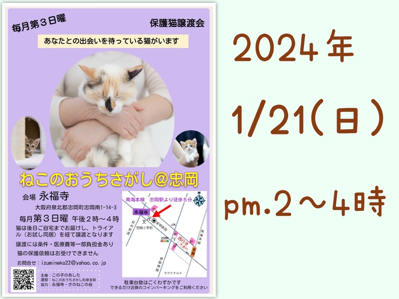 | イベント内容 | 保護猫と蚊帳やテントの中で触れ合える里親会(譲渡会) 保護猫を家族に迎え入れる選択肢をご検討いただけませんか? 第25回ねこのおうちさがし@忠岡 開催日 : 2024年1月21日(日) ☆第3(日)定例開催 時間 : 午後2時~4時 場所 : 永福寺 大阪府泉北郡忠岡町忠岡南1丁目14−3 南海本線忠岡駅より徒歩約5分 ☆会場へのお問い合わせは固くお断りします。 ☆里親希望申込は先着順ではありません☆ 里親会終了後に検討させていただきますので、分散してご見学くださいますようご協力お願いします ★譲渡には完全室内飼育、同意書への署名・捺印などの条件、医療費等の一部負担があります。 ★猫さんは、後日お届けとなります。 当日連れて帰ることはできません。 ★参加予定の猫さんは、里親会の前に里親さまが決定する場合や、体調により不参加となる場合があります。 主催:この子のあした 運営:ねこのおうちさがし和泉支部 協力:永福寺・さのねこの会 参加猫は、はてなブログ 「ねこのおうちさがし@忠岡」 https://www.izumineko22.com/ にて順次紹介します |