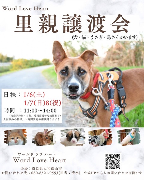 | イベント内容 | ワールドラブハートで里親募集中の動物たちの譲渡会を開催します! 犬猫だけではなく、インコやラット、ウサギにモルモットなどたくさんの保護動物がいます! みんな新しい家族を探しています。写真だけでは伝えきれない魅力が盛りだくさん! 実際に会ってそのかわいさを実感してください♪ ★里親募集中の動物たち★ https://satoya-boshu.net/foster/?@button_name@=search&FosterParent_MemberID=1161 ・犬、猫 ・ウサギ ・インコ ・キンカチョウ ・ウコッケイ ・ヘビ ・カメ ……など 子犬や子猫もたくさんいますよ♡ ぜひお気軽にお越しください! ●混雑をさけるために、事前予約をお願いします。 予約番号080-8521-9553 ショートメールでも可♪ ●当日までに譲渡が決定した・体調がすぐれないなど、やむを得ない理由で不参加の場合があります。ご希望の子がいましたら、当日お問い合わせください。 ●当日、その場での引き渡しはしておりません。譲渡決定後、自宅訪問を兼ねてこちらからお届け致します。 ご来場お待ちしております♪ ★world love heart(ワールドラブハート)は、奈良県大和郡山市で活動している動物保護団体です。 『引き取り依頼は断らない』をモットーに、犬、猫、鶏、小動物、家畜、爬虫類など捨てられた動物を保護しています。 https://worldloveheart-nara.jimdofree.com |