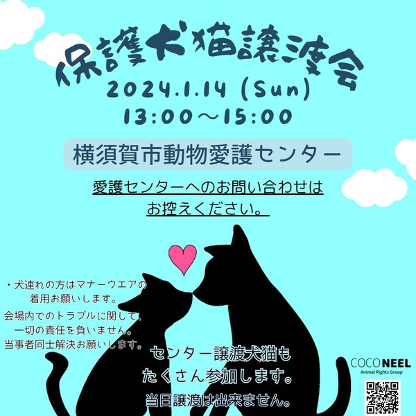 | イベント内容 | COCO NEEL譲渡会IN横浜 2024.1.14 (日) ・会場・ 横須賀市動物愛護センター 駐車場の用意はありません。 近隣のコインパーキングのご利用をお願いいたします。 ・時間・ 13:00~15:00 ※参加犬詳細はブログでご確認お願いします。 https://ameblo.jp/coconeel-animalrights |