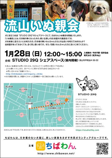 | イベント内容 | “STUDIO 29Q”にて第22回 流山いぬ親会を開催いたします。 飼い主探しをしている保護犬達に会いにきてみませんか。 ※いぬ親会見学は予約等必要ありません。無料でどなたでも入場できます。ただし、混雑を避けるために入場制限をさせていただく場合があります。 ※ネットによる募集も平行して行っているため、参加予定の犬が当日までに決定・不参加となる場合もあります。 ※イベントバナーに写真が掲載されている犬が参加するとは限りません。参加犬は本サイトに順次掲載されますのでそちらをご確認ください。 開催日:1月28日(日)12:00~15:00 室内開催:雨天決行 (荒天中止) 場所:STUDIO 29Q シェアスペース(2階) 千葉県流山市平和台4-36-22 【会場アクセス】 流鉄流山線「平和台駅」下車。踏切を渡り200m程直進、左側交差点角。駅より徒歩約3分。 駐車場はございません。当日お車の方は近隣のコインパーキングをご利用ください。 【注意事項】 《ご来場される皆様へのお願い》 臆病な性格の犬や、子供さんを苦手とする犬も参加しています。いきなり触ったりせず、まずボランティアに声をかけてください。 お子様と一緒にご来場される際には、手を繋ぐなどして頂き、お子様だけで参加犬に近づくことのないようご注意ください。 ※会場に同伴される犬には、必ずリード(引き綱)をつけてください。 【お知らせ】 ◆会場ではチャリティグッズを販売します 【お問い合わせ】 いぬ親会について:https://chibawan.net/inquiry_chiba ※いぬ親会当日はメールが見れません。また、お問い合わせの際は、必ず「具体的な件名」を入れて多数の迷惑メールと区別がつくようにお願いいたします。 流山いぬ親会イベントホームページ https://chibawan.net/event/20240128-nagareyama-dog ちばわんホームページ https://chibawan.net/ |