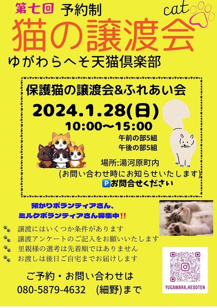 | イベント内容 | 神奈川県西部湯河原町で猫の譲渡会を開催します。 多数の子猫成猫参加します。 猫の普段の様子、性格等預かりスタッフとゆっくり話して猫と触れあってご自身に合うこを迎えて頂く為に予約制となっています。 ご家族皆さんで会いに来てくださいね。 ※里親様は、神奈川県東京都静岡県お届けフォロー出来る範囲に限らせて頂いています。 ※譲渡会は毎月開催、譲渡会以外の日でも個別お見合い対応しています。 |