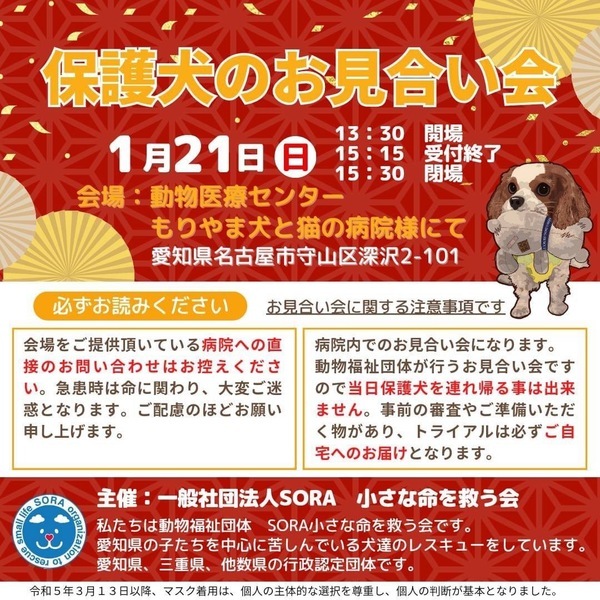 | イベント内容 | 保護犬の譲渡会を開催致します。 【注意】会場をご提供頂いている病院への直接のお問い合わせはお控えください。 急患時は命に関わり、大変ご迷惑となります。 ご配慮のほどお願い申し上げます。 もりやま犬と猫の病院さま 2階会議室 〒463-0811 名古屋市守山区深沢2-101 《ご注意》 家族希望ワンコがいる場合のお見合いに限定させていただきます。 事前のお申込みは不要です。保護活動ブログで、開催日の数日前に譲渡会参加が決定したワンコたちのご案内もしておりますので、ご希望のワンコの参加をご確認してお越し頂けますと幸いです。 なお、新型コロナウィルス感染拡大の状況におきまして、中止させていただくこともございますのでご了承下さい。 SORA公式ホームページ https://sora-chiisana.org/foster/ SORA公式活動メインブログ https://ameblo.jp/sora-chiisana-inochi/ SORAイベントブログ https://ameblo.jp/sora-charity-events/ |