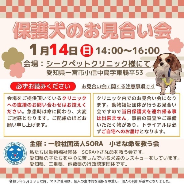 | イベント内容 | 保護犬の譲渡会を開催致します。 【注意】会場をご提供頂いている病院への直接のお問い合わせはお控えください。 急患時は命に関わり、大変ご迷惑となります。 ご配慮のほどお願い申し上げます。 シークペットクリニック様 〒494-0007 愛知県一宮市小信中島字東鵯平53 《ご注意》 事前のお申込みは不要です。保護活動ブログで、開催日の数日前に譲渡会参加が決定したワンコたちのご案内もしておりますので、ご希望のワンコの参加をご確認してお越し頂けますと幸いです。 SORA公式ホームページ https://sora-chiisana.org/foster/ |