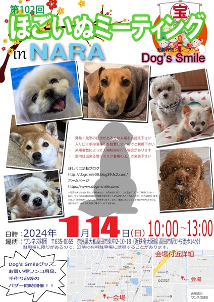 | イベント内容 | 1月14日(日曜日)10時~13時、奈良県大和高田市のワンネス財団エモーショナルリテラシーセンターにて「第102回ほごいぬミーティングat奈良大和高田」を開催します。 保護犬を家族に迎えようと考えている方、保護犬に会ってみたい方、保護犬について知りたい方、ぜひご来場ください。 相性を見るためなど先住わんこさん、卒業わんこさんのご参加ももちろんOKです。 当日は、Dog's smileグッズやワンコ用品の販売、Dog's smileを応援してくださる方々が手作りされた手作り雑貨などの販売も行います。どれもお買い得です。 また、売り上げは、私たちの活動資金になります。ぜひご協力をお願いします。 来場者のみなさまには、コロナウイルス感染拡大防止に御協力をお願いします。 ・発熱・風邪の症状のある方の入場は御遠慮願います。 ・入場時は、手指消毒への御協力をお願いします。 ・来場者の状況により、入場制限を行う場合があります。 なお、来場予定のワンコについては、活動ブログでご確認ください。 日時 令和6年1月14日(日)午前10時~午後1時 場所 ワンネス財団エモーショナルリテラシーセンター 奈良県大和高田市東中2-10-18 (近鉄南大阪駅高田市駅から南に徒歩14分) 協力 ワンネス財団、株式会社松田電気工業 |