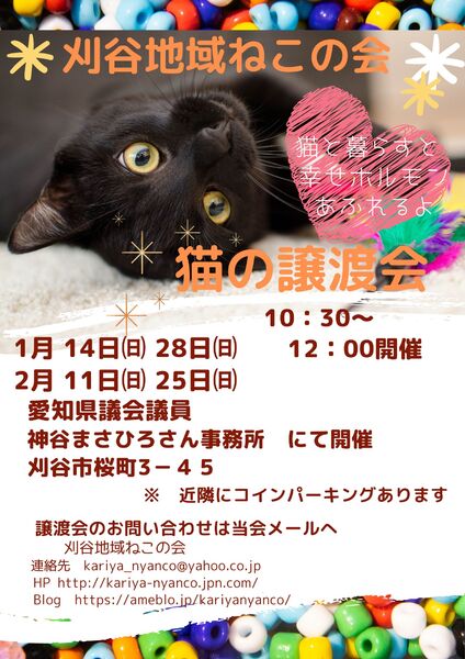 | イベント内容 | 検温させて頂き、37℃以上の方は入場をお断りさせて頂きます。 ご来場いただいた方の数により、入場や時間を制限させて頂く場合がございます。 単身者・未婚のカップル、 60歳以上の方のみのご家庭は譲渡対象外とします。 (後見人がいる場合は例外ですが、同意書を頂きます) 希望者様条件(家族の同意、ペット可住宅、終生飼育、不妊去勢手術、ワクチンなど適正医療、 脱走防止具体策など)を確認させて頂きます。 その際は家族希望アンケートにご記入いただきます。 譲渡までのながれ < 面会 > 譲渡会へお越しいただく。 猫が決まったら家族希望アンケートを記入していただきます。 < お届け > 基本的に面会時のお渡しではなく、後日のお届けとなります。 当会から、担当の者が猫をご自宅までお届けし、飼育環境の確認をさせていただきます。 (脱走が強く懸念される場合は、譲渡をお断りする可能性があります。) ★ 遠方の方の場合は、往復の高速代をお願いしております。 < トライアル(お試し生活)> トライアル契約書を記入。 原則として期間は2週間程度(延長・短縮あり) この時点で譲渡金をお預かりさせて頂きます。 金額: 不妊手術していない猫 15,000円 不妊手術終了猫 20,000円 (2020.04月 改定しました) < 正式譲渡 > ★避妊・虚勢していない状態で譲渡する猫に関しましては、 手術終了後まで見守らせていただきます。 刈谷地域ねこの会 ホームページ http://kariya-nyanco.jpn.com/ Blog https://ameblo.jp/kariyanyanco/ |