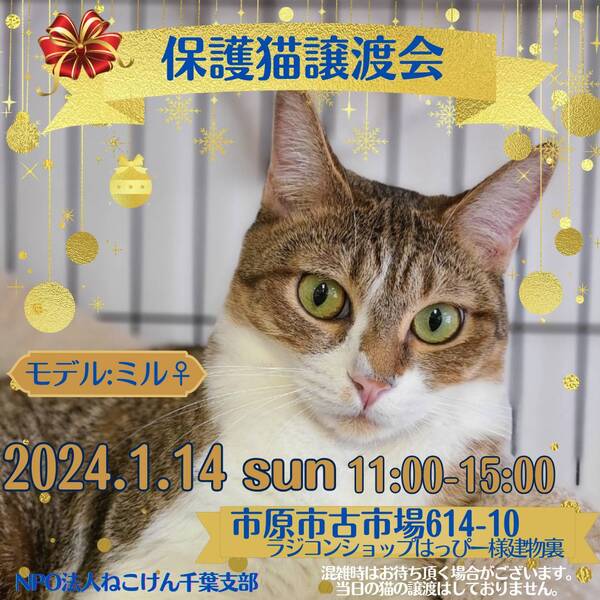 | イベント内容 | 今年生まれの子猫から大人猫まで、沢山の保護猫達が譲渡会に参加します♪ ブログにて、譲渡会に参加する猫さん達を紹介しております。 ねこけん千葉支部ブログ→ https://ameblo.jp/nekoken-chiba/ 通常スタイルの譲渡会と致しますが、コロナウイルス対策として ・会場内ではマスクのご着用と入退室の際は消毒をお願い致します。 ・ご予約無しでお越しいただけますが、混雑時は整理券を配らせていただきます。 ご協力の程よろしくお願い致します。 また、譲渡会会場では、千葉県内にお住いの預かりボランティアさん及びお世話ボランティアさんを募集しています。 ご希望の方は、大変お手数をおかけしますが、譲渡会までお越しください。 ※ご都合がつかない場合は、お問い合わせ先までご相談ください。 [日時] 1月14日(日)11:00~15:00 [会場] 千葉県市原市古市場614-10 ※屋内での開催となり雨天決行です。 ※抱っこもOK! ※猫ちゃんの負担も考え、ご来場は時間内にお願い致します。 ※特にご予約などは必要ございませんのでご家族皆様でぜひお越し下さい。 ※駐車場あり。 [交通] 交通機関を利用してお越しの方 JR内房線 浜野駅より徒歩13分 浜野駅は、東京駅から京葉線→内房線でおよそ50分の距離!! お車でお越しの方 京葉道路蘇我インターより車で10分 ※駐車場はラジコンショップハッピー様裏手にございます駐車場をご利用ください [譲渡ご希望の方へのお願い] 誠に恐れ入りますが下記に当てはまります方への譲渡は不可となりますので予めご了承下さい。 ①学生さん、未成年の方、安定収入のない方 ②ペットを飼う事を許されていない住宅にお住まいの方 ③身体的、精神的疾病で治療中の方 ※60歳以上の方は別途条件がございますのでご相談下さい。 [譲渡の流れ] お申込み→審査→後日お届け→トライアル→正式譲渡 ※当日のお連れ帰りは出来ませんので予めご了承ください。 ※仮譲渡時にご希望の猫ちゃんにかかった医療費(血液検査・ワクチン・駆虫・不妊去勢手術等)をご負担願います。 しかし、正式譲渡に至らなかった場合は医療費を全額返済致します。 [主催] 動物愛護団体 NPO法人ねこけん 千葉支部 [ブログ] https://ameblo.jp/nekoken-chiba/ [参加動物] 成猫・子猫(ねこけん保護猫以外の猫ちゃんも参加予定です) [お問い合わせ] ご不明な点、ご質問等ございましたら下記までお問い合わせください。 chiba.info@nekoken.jp |