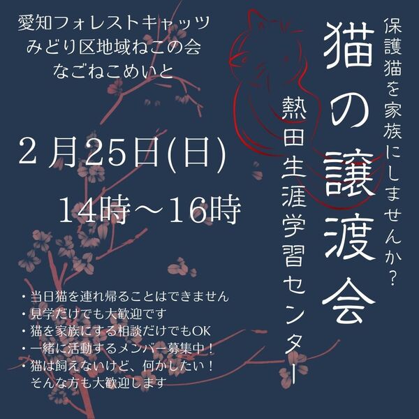 | イベント内容 | 保護猫の里親になりませんか? 日時 2月25日(日) 14時〜16時 場所 熱田生涯学習センター 名古屋市熱田区熱田西町2-13 主催 愛知フォレストキャッツwithなごねこめいと 参加団体 みどり区地域ねこの会 地域猫活動やTNR活動の過程などで 保護した猫たち 子猫もいれば、大人猫もいます この時期は5〜9ヶ月程度の 子猫が多く参加します 見学、相談だけでも大丈夫! 予約不要、参加費無料なのでお気軽に 猫に関する活動を何かしたい、という方も歓迎です 遊びに来る感覚で、お越しくださいませ ☆猫に関して☆ 各団体の保護主さんごとに決めているお約束事があります ・当日は猫を連れ帰ることはできません ・猫を迎えるにあたり、飼育環境などについて お話しをさせていただきトライアル(お試し飼育) から始めさせていただきます ・2週間前後のトライアル期間を経て、問題ない ようであれば、譲渡契約書を結び正式譲渡と なります ・所定の譲渡費用をいただきます |