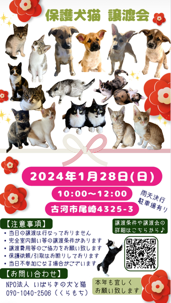 | イベント内容 | いばらきの犬と猫 譲渡会を行います✳︎ 可愛い保護犬猫を家族に迎えてみませんか? 予約不要/雨天決行/駐車スペース有 (開催場所が分かりにくいので下記の連絡先までご連絡頂ければご案内致します) ※譲渡条件などありますので当会の里親募集ページやHPをご確認ください※ 【不要になったフード(未開封).タオル.ペットシート.新聞紙などありましたら、ご寄付いただけると助かります】 お待ちしております☻♪ 【ボランティアのInstagram】 https://instagram.com/minna_ikiteiru?igshid=OGQ5ZDc2ODk2ZA%3D%3D&utm_source=qr ⚫︎お問合せ⚫︎ 電話▷090-1040-2506 (クラモチ) LINE ID▷ 717217 (モトハシ) |