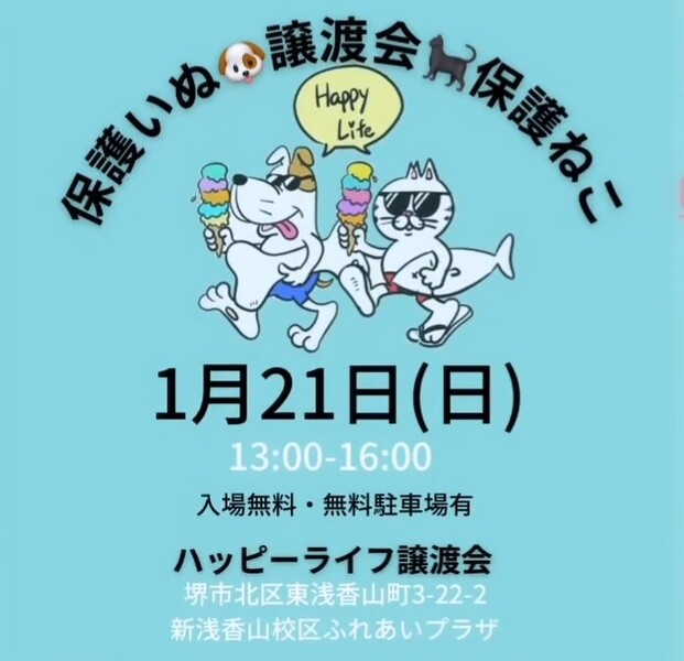 | イベント内容 | 大阪府堺市でHappy Life(ハッピーライフ) 譲渡会が開催されます! この譲渡会は犬・猫を保護している個人ボラさん達が集まる、 合同譲渡会になっています。 ●開催日時● 1月21日(日)13時~16時 ●開催場所● 大阪府堺市北区東浅香山町3-22-2 新浅香山校区ふれあいプラザ 駐車場数台あり(近隣にコインパーキングも複数ございます。) 今回も新しい家族との御縁を待っている、 犬・猫達が沢山参加する予定です。 アニマルボランティア 秋桜からは パピヨンのチコ(D338659)、チワワの想(D337868)、 トイプードルのカール(D339041)とジニー(未掲載)、 パピヨンのあかり(未掲載)、ひろし(未掲載)、 うめこ(未掲載)、ゆかり(未掲載)の8匹が参加予定です。 (お問い合わせやお見合い予定が入った場合、体調面などでお休みする場合もございます。) ●アニマルボランティア 秋桜は大阪府八尾市を拠点に犬の保護活動をしている、小さな団体です。 ●保護犬の中で気になる子が居てる場合、事前にお問い合わせ頂けましたら、 里親希望者様事前アンケートをメールにてお送りさせて頂いて→ 書類審査がクリアしてましたら→譲渡会場でお見合いして頂く事も可能です。 ●譲渡会に関するお問い合わせは Instagramから主催者様 @happy_life_catdog にDMもしくは アニマルボランティア 秋桜の保護犬に関しては下記アドレスに直接お願いします。 animalcosmos★yahoo.co.jp (メール送信時に★を@に変えて下さい。) ●この子達にとってベストなご家庭へ送り出したいので、早いもん勝ちではございません。 当日、その場での引き渡しはしておりません。 譲渡審査などを経て譲渡決定後、自宅訪問を兼ねてこちらからお届けいたします。 (里親希望者様事前アンケートで譲渡条件がクリアしていない場合や 希望者様多数の場合はお断りさせて頂くこともございます事、ご理解下さい。) 里親募集中の保護っ子達に直接会って頂ける機会です。 エアコン完備の室内での開催になりますので、感染症対策をしてお越し下さいませ。 ~御来場予定の皆様へ~ 感染症対策の為、マスクと靴下着用で来場お願いします。 沢山の方々が出入りしますので、会場入口受付にてお名前、ご住所、連絡先のご記入をお願いします。 主催者様のInstagram @happy_life_catdogで参加する犬猫達の情報が確認出来ます。 ご来場お待ちしております♪ |