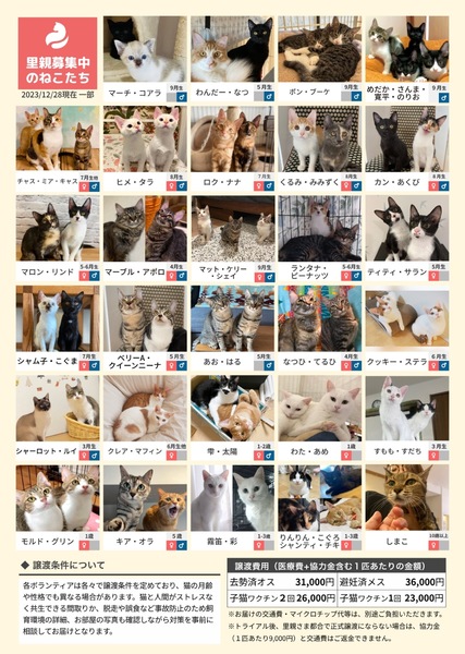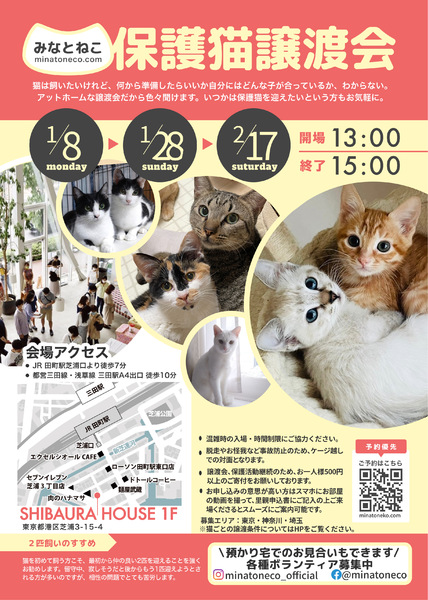 | イベント内容 | みなとねこが毎月定期開催している譲渡会です 2024年も譲渡会を通じて289匹もの猫を161家庭にご縁を繋ぐことができました 譲渡会にはご来場予約が必要です ご予約はみなとねこのHPよりお願いします https://www.minatoneco.com/event 参加猫の詳細はこちら https://www.minatoneco.com/gallery 参加猫たちの様子はYoutubeのみなとねこチャンネルもご覧ください https://youtube.com/playlist?list=PLRxhCqU-Dt77IaUtZCDeratPPI7Jek6ZL ーーー 会場は明るく開放的な雰囲気です Youtube「みなとねこ譲渡会に行ってみよう」 https://youtu.be/8Q4Gti1swQk 30ケージ 60匹ほどの参加となりますが、それ以外の預かり宅の猫もご紹介可能です 子猫は2匹ペアでの譲渡が原則です 初めての方こそ最初から2匹をお勧めしています また私たちボランティアは、ご縁のあった猫たちに終生里親様に愛されて幸せに安全に暮らして欲しいと願っています このため里親になっていただくにはいくつかの条件やお約束事があります。 ◆基本条件(猫それぞれ、保護主により異なります) ・ご家族全員が飼育に賛成であること ・ペット可物件での完全室内飼い、エアコンなどによる室温管理、医師の指示に従い定期的な受診やワクチン接種、 適切な時期(生後4ヶ月中)での避妊去勢、病気予防に配慮したフードの選択、終生飼養をお願いしております。 ・ケージのみの飼育、リビング以外の一室のみでの飼育は不可です。十分な運動のスペースと窓から景色が眺められのんびり日向ぼっこが可能な環境が望ましいと考えています。 ・誤食などの事故防止のため、お部屋の整理整頓や脱走防止にも万全の対策をお願いします。 ・換気が十分でない室内での喫煙をされる方はお断りしております。 ・日々のお世話だけでなく、スキンシップが可能な精神的・時間的・経済的な余裕がある方に限らせていただきます。猫が20年以上生きる中でなるべく変わらぬ環境で愛情を注いで頂けるよう、家族構成やお仕事、お住まいに変化のない方を優先させていただきます。 またお届けやフォローの都合上、募集エリアも東京、神奈川、埼玉に限らせていただいております。 ■里親申込書類一式はみなとねこHPよりダウンロードをお願いします https://www.minatoneco.com/foster-entry 会場では里親申込書を拝見して簡単な面談を行います 会場にてご記入いただくことも可能ですが、面談希望の方が多いとお待ちいただくことになりますので、お手元で印刷していただきご記入の上ご来場いただくことをおすすめしております ※ご家族にアレルギーがある方、喫煙者がいる場合には是非事前にご相談ください ※猫と暮らしたことのない未就学児がいらっしゃる場合には事前にアレルギー検査などお勧めします 実際の参加予定猫 1/27(土)21:00までにみなとねこのHPやFacebookページでご紹介します https://m.facebook.com/minatoneco/ 直接ご応募の方は詳細をLINEなどでやりとりの上で預かり宅でのお見合いも行っております そうした中で譲渡会前に里親様が決定することもございますことご了承ください ※予約優先、30分入替制、混雑時は入場をお待ちいただくなどのご協力をお願いしております ※換気のためにドアをオープンしての開催のためにケージ越しでのご対面となりますことご理解ください ※譲渡会の開催や保護活動の継続のため、お一人様500円以上のご寄付をお願いしております |