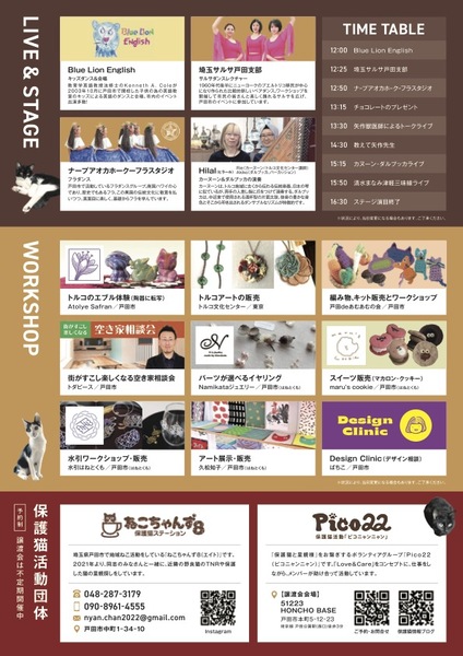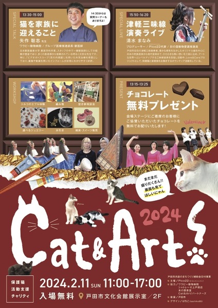 | イベント内容 | 【保護猫啓発イベント】 Cat&Art!2024〜保護猫チャリティー〜 2024.2.11SUN 11:00-17:00 入場無料 戸田文化会館展示室/2F 彩の国動物愛護推進員である清水まなみが、保護猫とトルコ地震の周知を目的に戸田市で活動しているアートワーク作家によるワークショップとダンス、演奏によるステージショーのイベントを開催します。 会場では、獣医師と保護猫団体も参加して、「猫を家族に迎えること!」と称するトークショーを企画します。また、戸田市内のクリエイターとの共創による、来場した子ども、子育て世代、高齢者の出会いと相互理解(=コミュニケーション)を通じて、被災地の保護猫活動者向け”応援ポスター”を制作します。 <保護猫のセミナー> 「猫を家族に迎えること」「教えて矢作先生」 講師:矢作聡志(ワラビー動物病院獣医師) <飼育相談、保護、TNRについて> 『Pico22』『ねこちゃんず8』 <ワークショップ、販売ブース> トルコアート、水引、アクセサリー、絵画、編み物、他。 【令和6年能登半島地震義援金募金箱】 受付に令和6年能登半島地震被災地支援として義援金の募金箱を設置いたします。皆様からの募金は全額を日本赤十字社埼玉支部戸田地区へ義援金としてご寄付いたします。 |