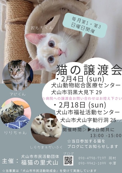 | イベント内容 | 【ココがポイント!】 ★ウイルスチェックなど健康診断済み! 【日時】 2月4日(日)13~15時 【場所】 犬山市動物総合医療センター (犬山市羽黒大見下29) 予約不要 広々駐車場あり 福猫の里 犬山「福猫の里便り」 https://hukunekonosato.hatenablog.com/ 問い合わせ先(福猫の里 犬山) a-saoka.922@outlook.com ーーーーーーーーー 【お約束】 当日、会場での猫の引き渡しはしておりません。 後日ご自宅までお届けします。 お試し飼育(トライアル)を1週間して頂き、双方が納得の上で正式譲渡となります。 譲渡の際は、医療費の一部の負担をお願いしております。(ワクチン代 等) ・ペット可のお住まい ・完全室内飼育、終生飼育 ・適切な医療措置 ・不妊手術の実施と報告等、お約束があります。 |