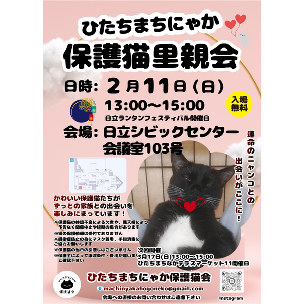 | イベント内容 | 2月は、日立スカイランタンフェスティバルの3日目に参加します! 元気いっぱいの子猫から落ち着いた大人猫まで、個人ボランティアが大切にお世話している猫ちゃん達が、ずっとの家族との出会いを待っています! 新都市広場ではハンドメイドショップやキッチンカー、ライブステージにスカイランタンフェスティバルと盛りだくさん! 是非可愛い猫ちゃんに会いに、遊びに来て下さい! 予約不要・入場無料 ※当日の保護猫の体調不良による欠席や、突然の天候不良の為の中止の場合がございます ※当日の保護猫の引渡しはございません ※感染症防止の為、マスク着用・手指消毒にご協力下さい ※猫の保護依頼・相談は受け付けておりません ※保護主によって譲渡条件・譲渡費用が違いますのでご確認下さい 〜里親を探したい保護主さんも随時募集しております〜 一緒に里親探ししませんか? 参加条件有・参加費無料 お問い合わせ先 ひたちまちにゃか保護猫会 email:machinyakahogoneko@gmail.com |