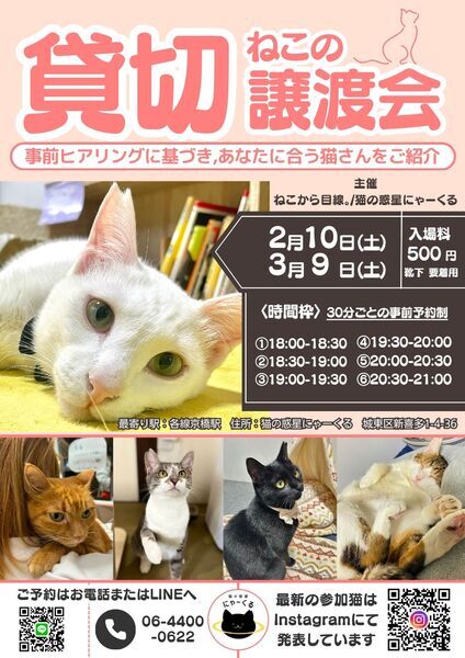 | イベント内容 | 【貸切の譲渡会!】 大阪京橋駅徒歩6分の場所にて 土曜日の夜18時〜21時まで 30分毎、完全予約制の 時間枠1組限定!貸切の譲渡会です! 家族を決める大事な時間なので ゆっくり貸切で相談しながら 家族になる猫ちゃんを決めていただけます✨️ 子猫さんからシニア猫さんまで 15匹以上の猫が参加予定です☆ もちろんおひとり様からご予約可能です! 場所:猫カフェ 猫の惑星にゃーくる (大阪府大阪市城東区新喜多1-4-36) 時間: 2月10日(土) ①18:00~18:30 ②18:30~19:00 ③19:00~19:30 ④19:30~20:00 ⑤20:00~20:30 ⑥20:30~21:00 入場料:1人500円(未就学児は無料) 主催:ねこから目線。 猫の惑星にゃーくる ホームページに詳細を記載しております。 https://www.nyacle.com/joutokai 参加猫情報は Twitter、Instagram各種SNSで 情報発信中です! 猫の惑星にゃーくると検索してください。 お問い合わせ、ご予約は 公式LINEかDMからどうぞ! https://lin.ee/QvoeCQI —————– ※靴下着用です。 ※駐車場はございません。近くのパーキングをご利用ください。 ※当日の猫を連れて帰ることはできません。 |