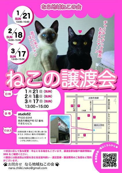 | イベント内容 | 毎月奈良市ならまちにて猫の譲渡会を行っております。 会場には会の保護猫ちゃんたちをはじめ、個人で活動されているボランティアさんが保護した猫や一般の方に保護され里親さんを探している保護猫など、沢山の保護猫たちが里親さんとのご縁を待っています。 また、会場ではチャリティグッズ販売も行っております。 皆さまのお越しをお待ちしております(=^・^=) 参加猫の詳細は https://www.facebook.com/nara.chiiki.neko/ https://www.instagram.com/nara.chiiki.neko/ にて告知します。 ※譲渡会の急な変更がある可能性もございます。最新の情報はSNSにてご確認お願いいたします。 |
