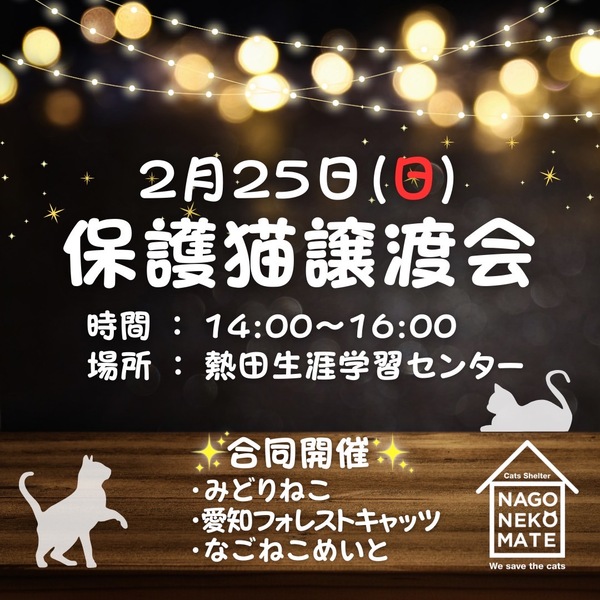 | イベント内容 | ねこの里親になりませんか? 可愛い猫たちが新しい家族を待っています♡ ご覧いただきありがとうございます 保護猫団体「なごねこめいと」です 譲渡会のお知らせです↓↓ 日時 2月25日(日)14時~16時 場所 熱田生涯学習センター 主催 ラブキャッツ 愛知フォレストキャッツ なごねこめいと 3団体合同の譲渡会です!たくさんの猫と出会えます☆ 地域猫活動やTNR活動の過程などで 保護した猫たち 子猫もいれば、大人猫もいます 見学、相談だけでも大丈夫! 予約不要、参加費無料なのでお気軽に 猫に関する活動を何かしたい、という方も歓迎です 遊びに来る感覚で、お越しくださいませ♬ 他にも保護猫譲渡会を開催しております。 ほかのイベント情報もご覧下さい♡ ☆猫に関して☆ 各団体の保護主さんごとに決めているお約束事があります ・当日は猫を連れ帰ることはできません ・猫を迎えるにあたり、飼育環境などについて お話しをさせていただきトライアル(お試し飼育) から始めさせていただきます ・2週間前後のトライアル期間を経て、問題ない ようであれば、譲渡契約書を結び正式譲渡と なります ・所定の譲渡費用をいただきます |