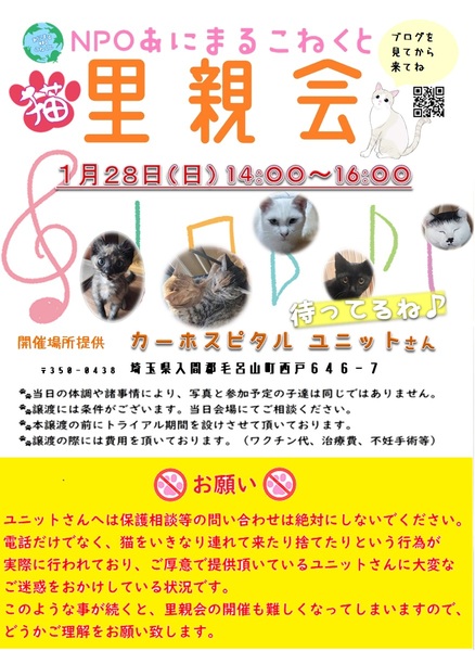 | イベント内容 | ブログをチェックしてからお越しください♪ 小さな会場ですが、子猫から成猫まで参加します! グッズ販売もあります♪ ※先着順ではなく里親会後に協議してより良い条件のご家族を選定させて頂いておりますので、お時間早い方が有利という事はありません^^ |