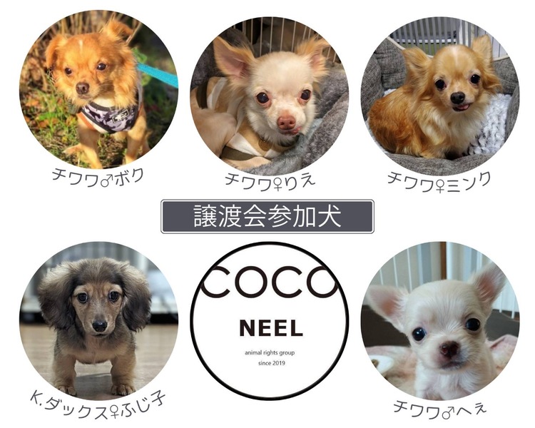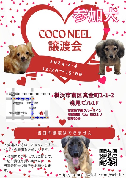 | イベント内容 | COCO NEEL譲渡会IN横浜 2024.2.4(日) ・会場・ 横浜市南区真金町1-1-2 浅見ビル1F 駐車場の用意はありません。 近隣のコインパーキングのご利用をお願いいたします。 ・時間・ 12:30~15:00 ※参加犬詳細はブログでご確認お願いします。 https://ameblo.jp/coconeel-animalrights |