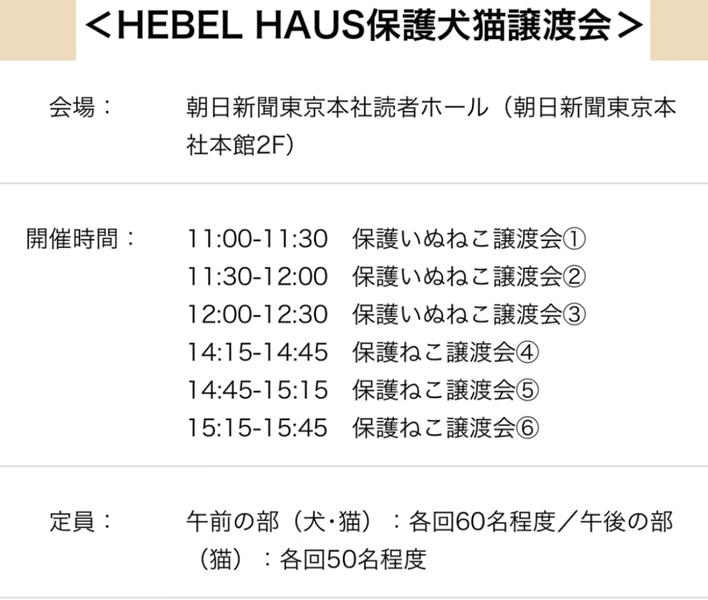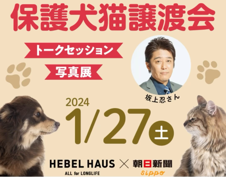 | イベント内容 | ☺︎保護猫カフェねこかつさんが午後の部で参加します。 ARHEBEL HAUS保護犬猫譲渡会@築地★ ご予約まだ間に合います! 1/27(土)のHEBEL HAUS保護犬猫譲渡会は事前予約制です ねこかつ他、保護団体が参加して保護犬&保護猫のお家探しを都内築地、朝日新聞東京本社で開催! 当日は坂上忍さんのトークセッションや 犬猫写真展も同時開催されます♥ 犬好きさん、猫好きさんみんなで保護動物を身近に思う1日にしませんか? ぜひぜひ! 事前にご参加予約のうえ、皆様でお越しください。 <HEBEL HAUS保護犬猫譲渡会> •朝日新聞東京本社 本館2階 •1月27日(土) 午前の部:11時~12時30分 午後の部:14時15分~15時45分 読者ホール <坂上忍さんトークセッション> ・朝日新聞東京本社 新館 2階 浜離宮朝日ホール・小ホール ・1月27日(土)13時~14時 主催:旭化成ホームズ&朝日新聞 sippo |